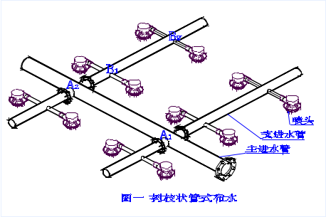 逆流冷卻塔循環(huán)水系統(tǒng)的布水方式采用管式布水,呈樹(shù)枝狀,循環(huán)水先進(jìn)入主管,然后進(jìn)入支管,再進(jìn)入噴頭,主管、支管、噴頭相互垂直,如圖一。根據(jù)流體狀態(tài)方程:壓力(P)×流速(V)=常數(shù)(K),循環(huán)水從主管流經(jīng)A1點(diǎn)、A2點(diǎn)后,到達(dá)主管末端,由于冷卻塔布水需要主管末端是封閉的,因此流速(V)急劇下降,壓力(P)急劇上升,所以A2處比A1處水壓頭大,同理B2處比B1處水壓頭大,綜上分析各布水噴頭處的水壓頭不相
